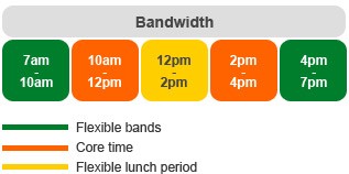 These flexible bands should at least contain a 2-hour window (e.g. 7am to 10am start time and 4pm to 7pm end time). Typically, there is a core time during which employees must work (e.g. 10am to 4pm).