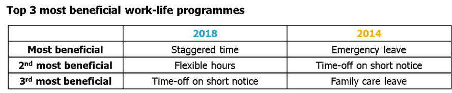 This was a shift away from the top 3 most beneficial FWAs cited in 2014 which were types of leave benefits: emergency leave, time-off on short notice, and family leave, suggesting that with FWAs, employees are able to integrate their work and life needs more effectively.