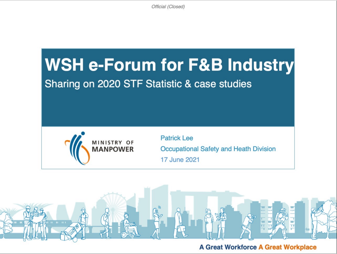 The WSH e-forum for the Food and Beverage Industry was held virtually on 17 June 2021 in conjunction with the Slips, Trips and Falls (STFs) Campaign 2021 which aims to promote the co-creation of safe workplaces by encouraging companies to set and fulfil an STF resolution to take time to check, clean and share to minimise or eliminate STF incidents together with their workers.