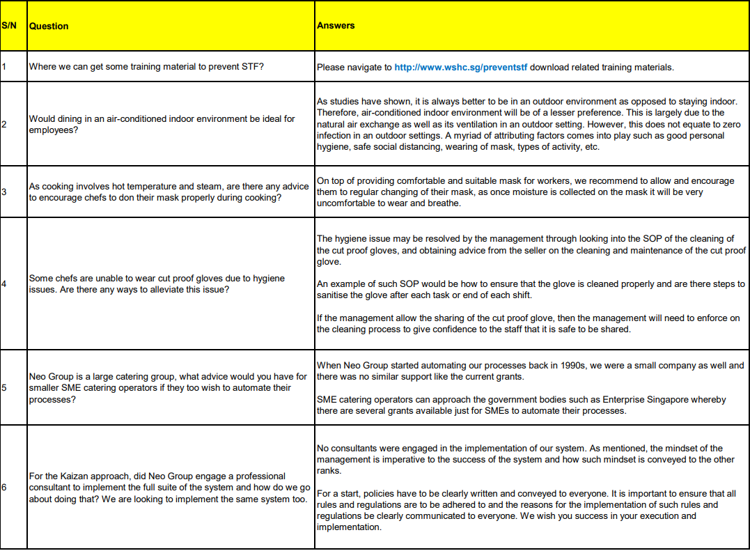 A series of STF case studies and preventive measures was also shared by the Ministry of Manpower. Speakers from FBMA and SCA shared their best practices to improve kitchen safety. The forum was rounded off with a lively sharing by Neo Group on how the company achieved its WSH goals through a combination of management and technological methods.