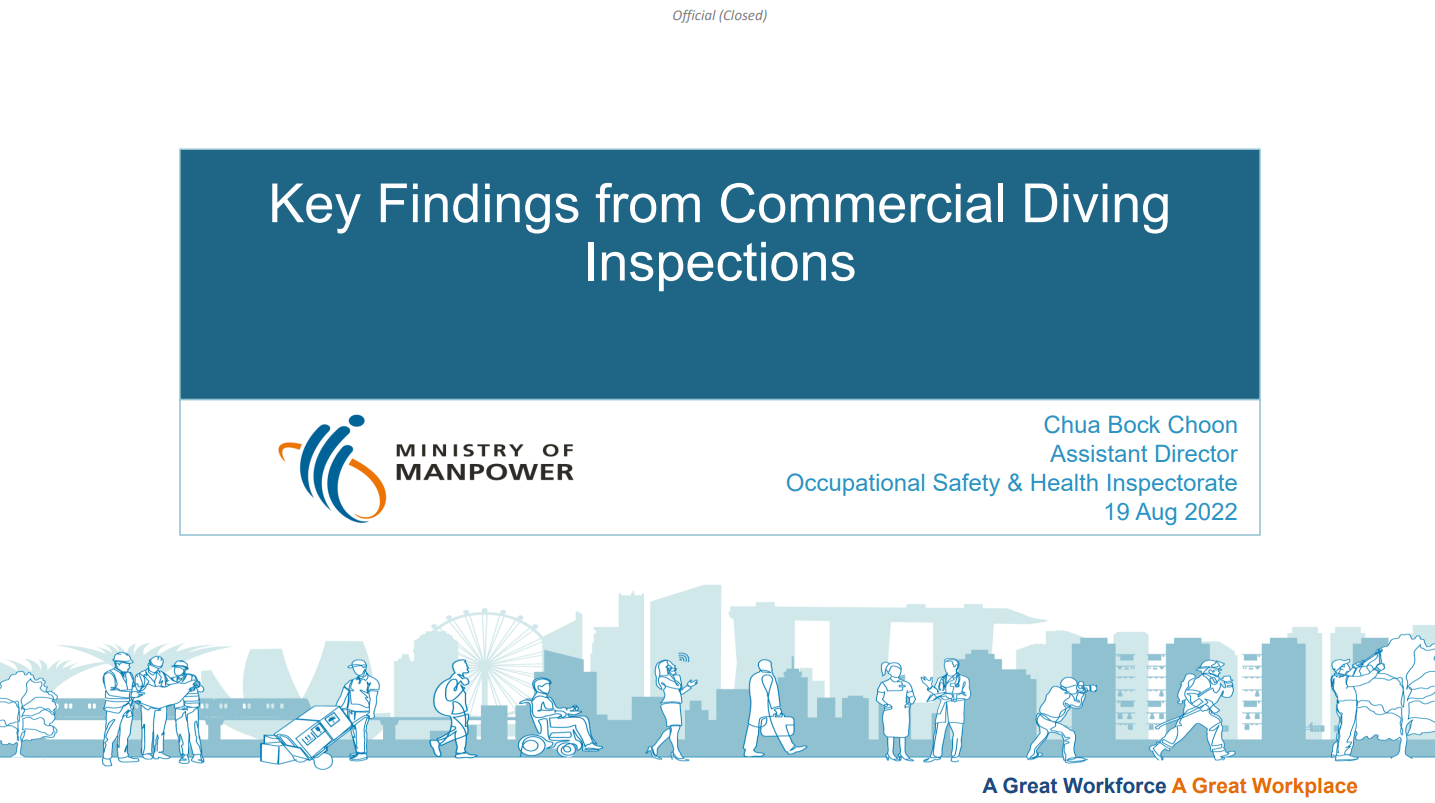 The Ministry of Manpower shared recent inspection findings related to diving activities. This was followed by speakers from the commercial diving industry, who presented on how pre-dive check, audits, emergency response plan and incident reporting should be included in diving activities. Lastly, the WSH Council shared on how the Total WSH programme can improve the worker’s safety and health, including the mental well-being aspect.