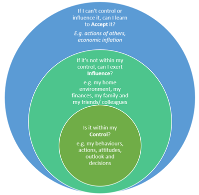 Break down your worries by categorising them into the three circles of Control, Influence and Acceptance as per diagram below. Choose to focus your energy on things within your control and influence.