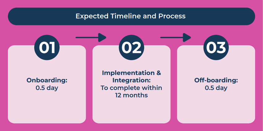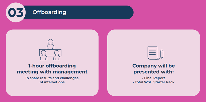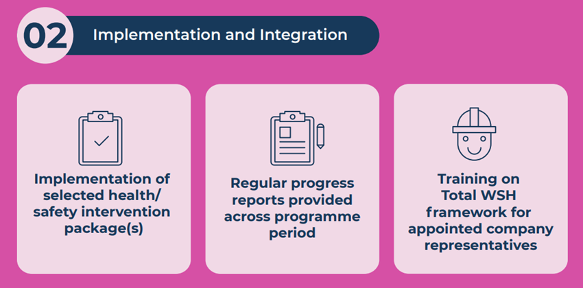 Your Total WSH service provider will guide you through the programme's onboarding, implementation, integration and sustainability, and offboarding phases: