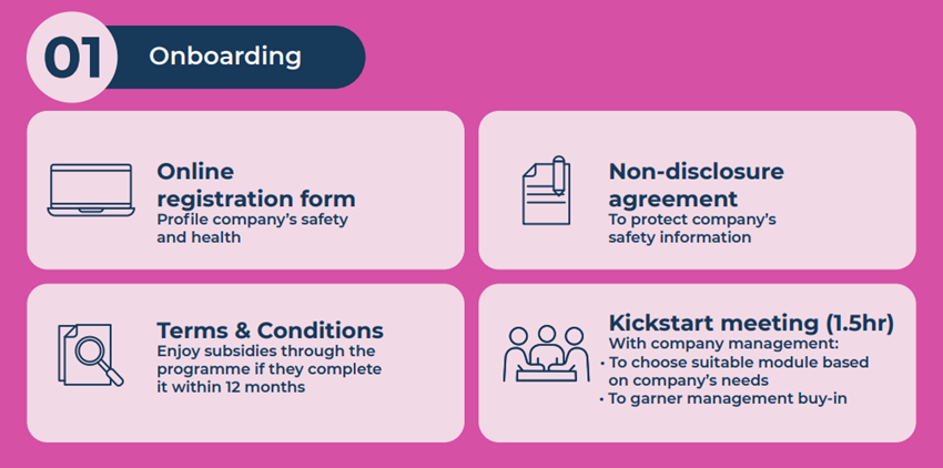 The Total WSH programme is a FREE1 programme where WSH Council-appointed Service Providers will teach your company how to manage safety and health with modular activity packages below.