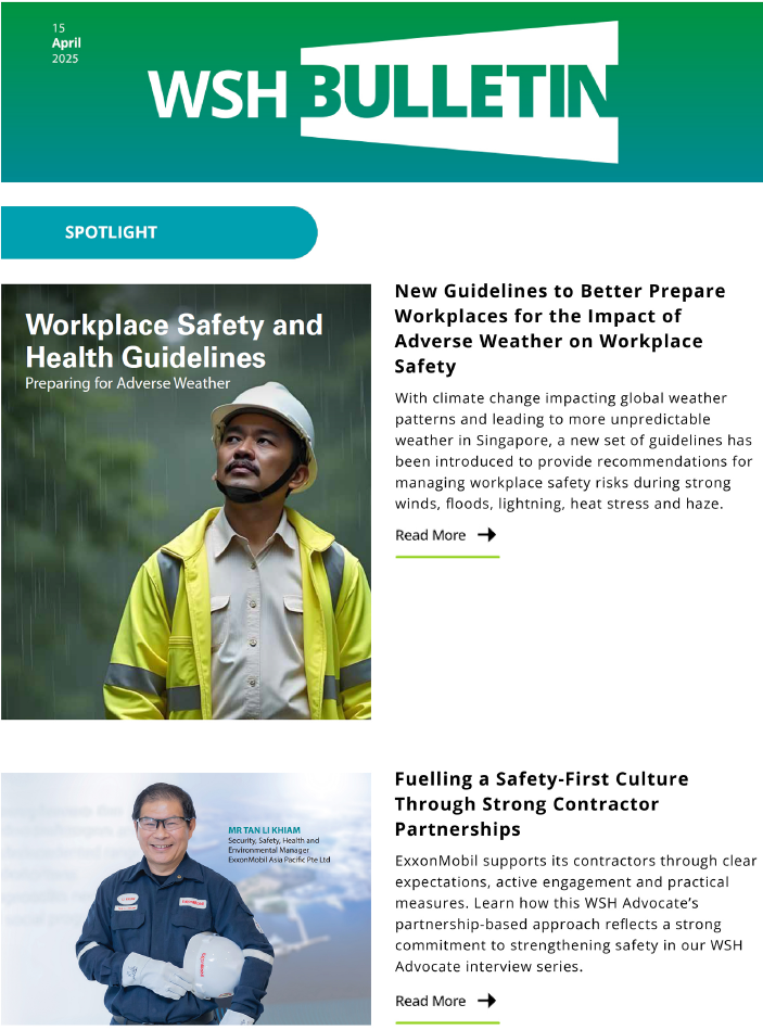Companies with extensive supply chains that are interested in being recognised as a WSH Advocate for progressive procurement practices can contact the WSH Council at wshadvocate@wshc.sg to be considered for induction.
