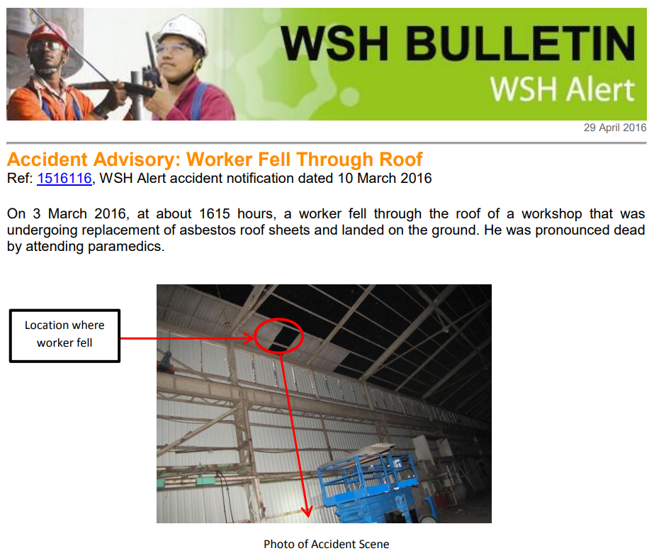 WSH Alert Accident Advisory 29 Apr 2016 Worker Fell Through Roof