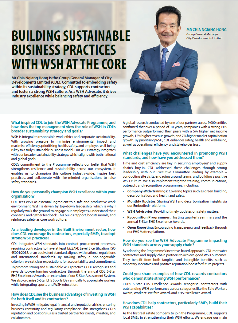 As the first real estate company in the WSH Advocate Programme, City Developments Limited integrates WSH into its sustainability strategy, setting clear standards and recognising strong WSH performance across its operations and supply chain.