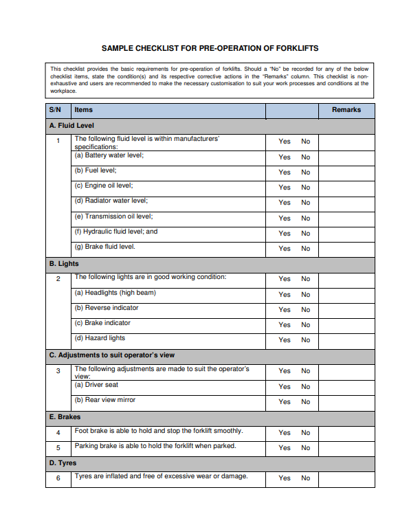 Safety Time Out sample checklist for Pre-Operation of Forklifts